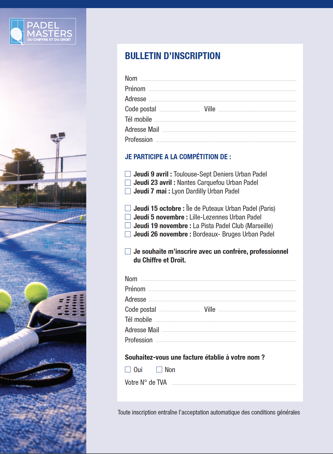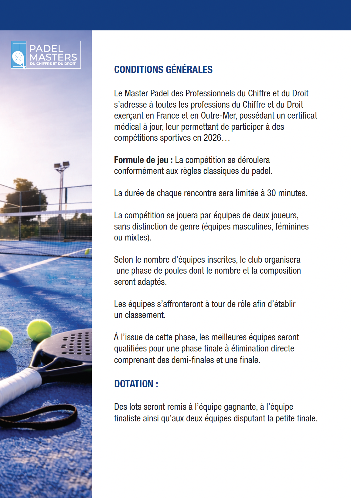 Le Master Padel du Chiffre et du Droit s’adresse à toutes les professions de santé exerçant en France et en Outre-Mer, possédant un certificat médical à jour, leur permettant de participer à des compétitions sportives en 2026…