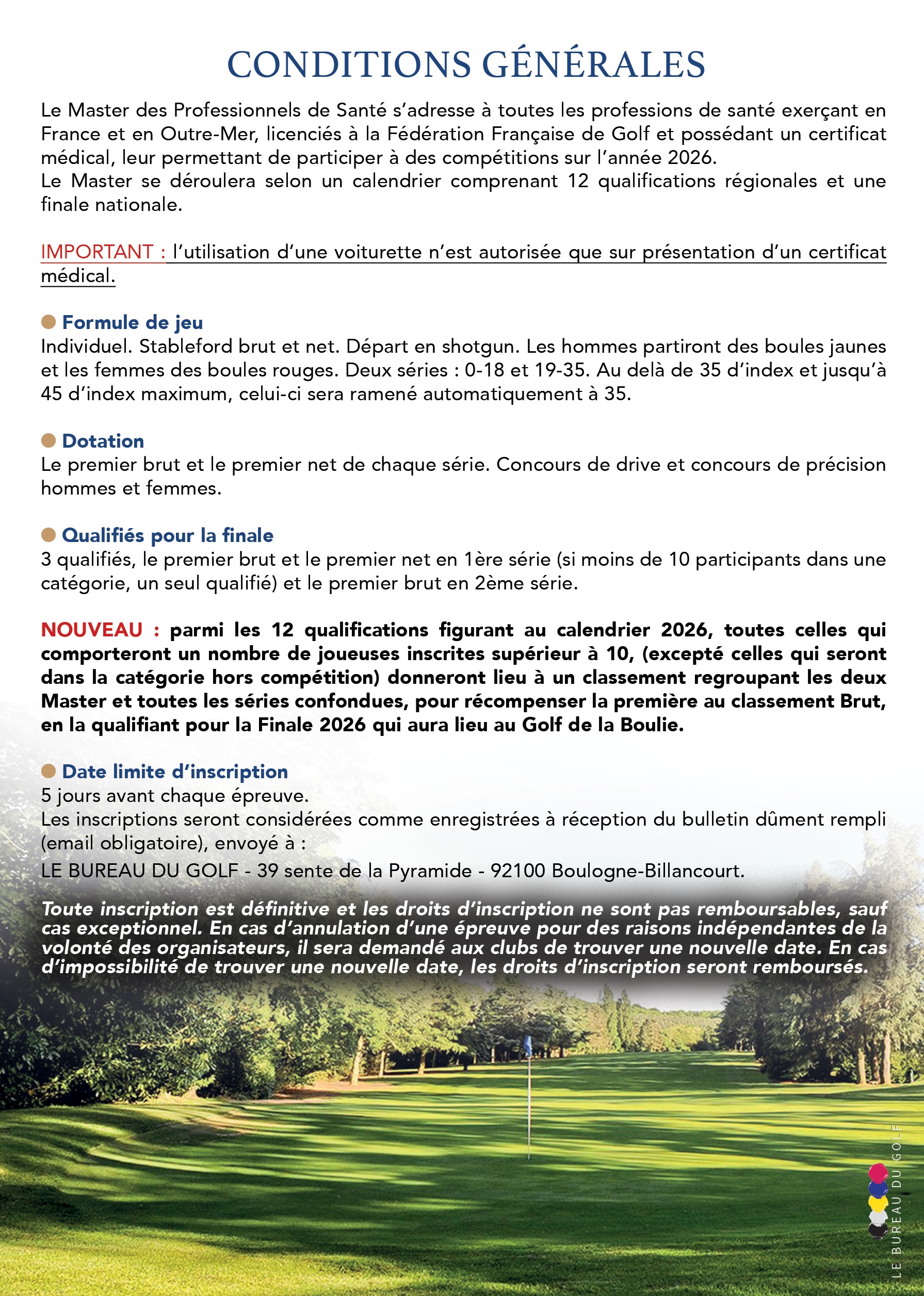 Nouveauté : parmi les 12 qualifications figurant au calendrier 2026, toutes celles qui comporteront un nombre de joueuses inscrites supérieur à 10, (excepté celles qui seront dans la catégorie hors compétition) donneront lieu à un classement regroupant les deux Master et toutes les séries confondues, pour récompenser la première au classement Brut, en la qualifiant pour la Finale 2026 qui aura lieu au Golf de la Boulie.